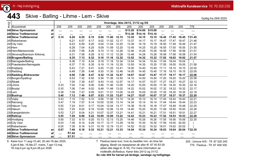 Køreplan for busrute 443 – Helårsplan