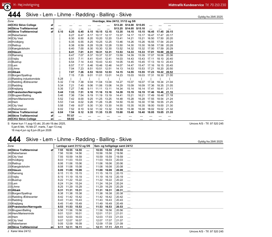 Køreplan for busrute 444 – Helårsplan.